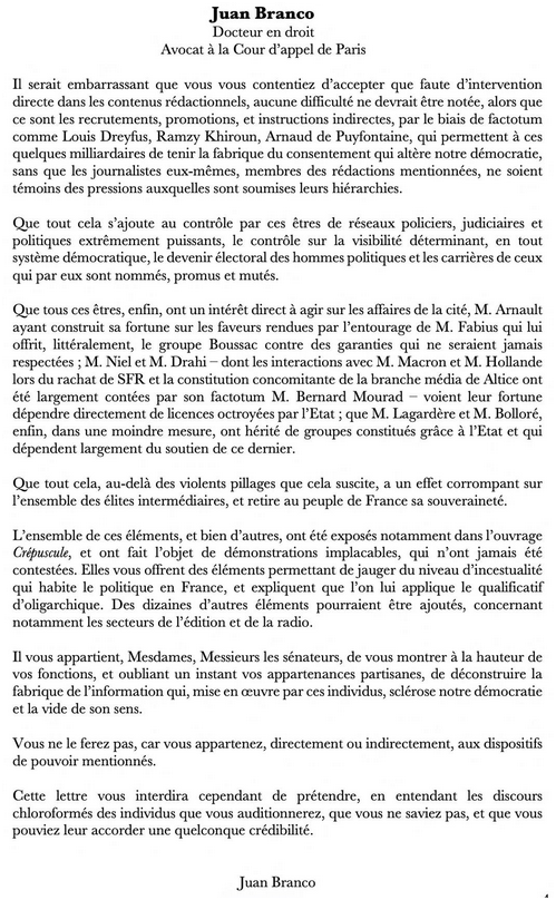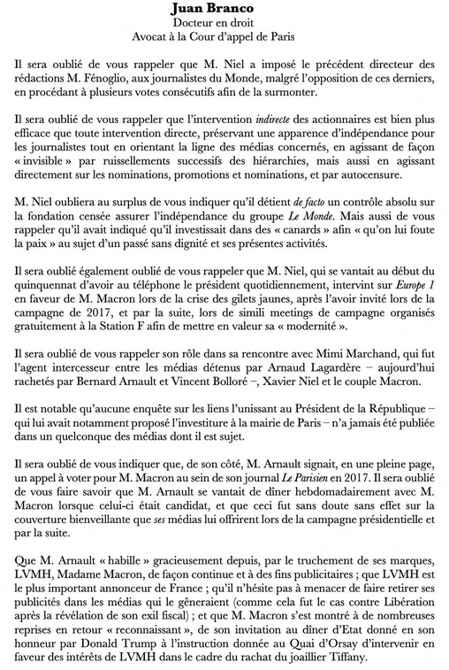Juan Branco dénonce la fabrique du consentement qui altère notre démocratie par l’ensemble des médias détenus par Niel, Lagardère, Arnaud et Bolloré