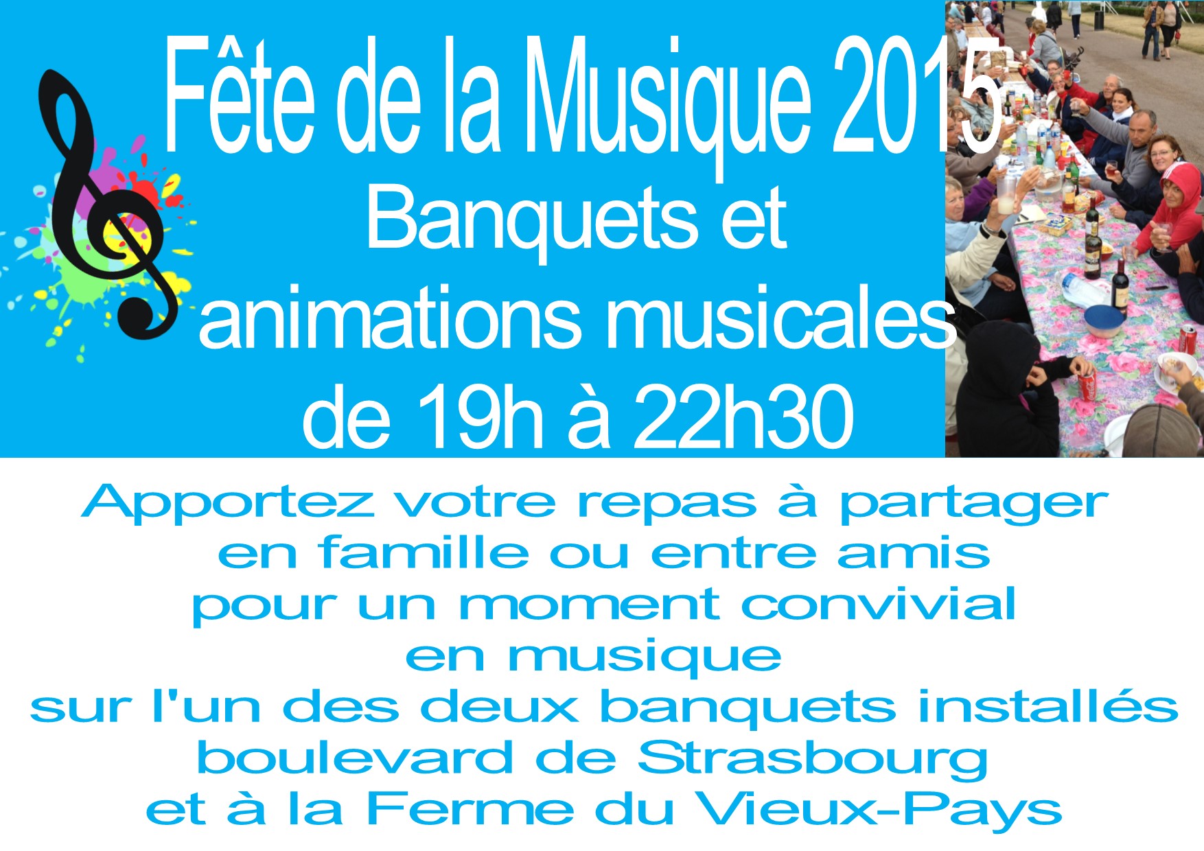 Dimanche 21 juin 2015, dans la cadre de la fête de la musique, deux banquets avec des animations musicales seront proposés de 19h à 22h30 :