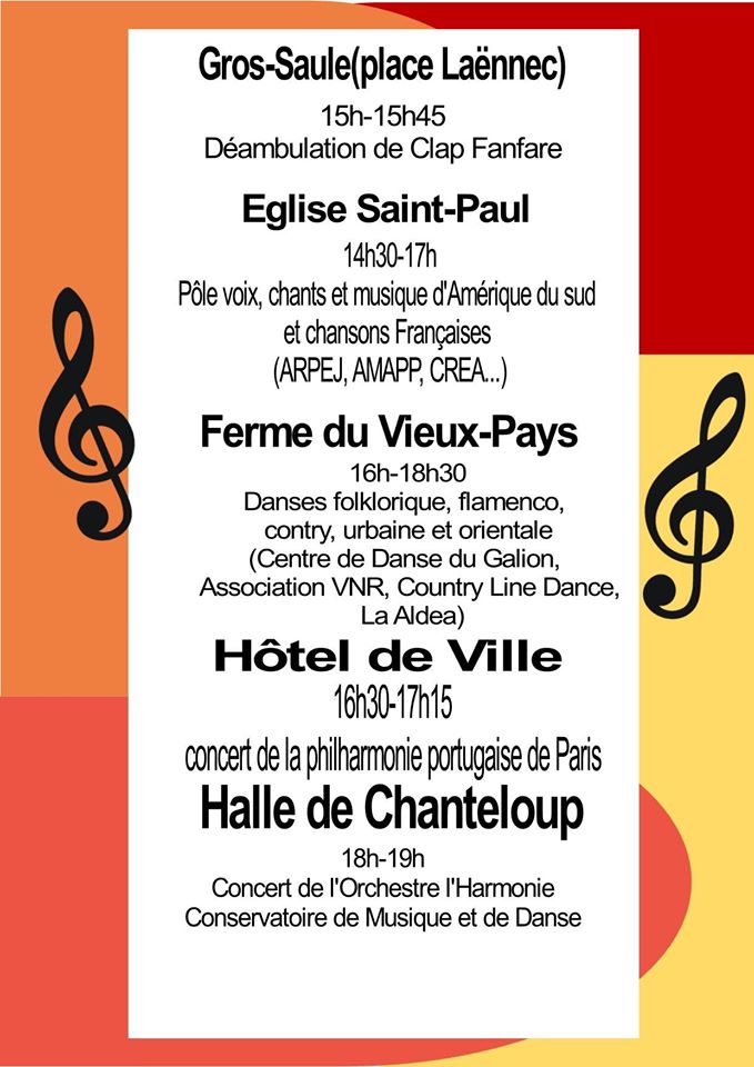 - 18h00 à 23h00, Antenne Jeunesse Tabarly (rue du Docteur Claude Bernard) : Chants, musiques et danses par les antennes jeunesse et clubs loisirs de la ville
