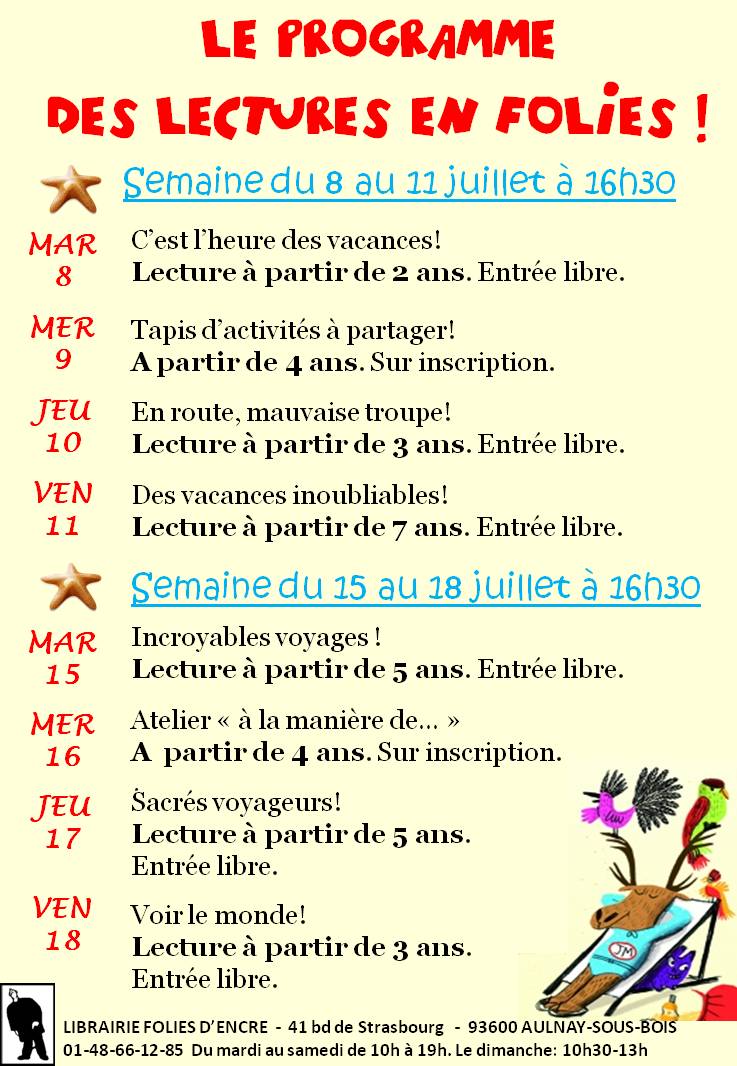 Librairie Folies d’Encre d’Aulnay-sous-Bois : le programme du 8 au 18 juillet des lectures en folies !