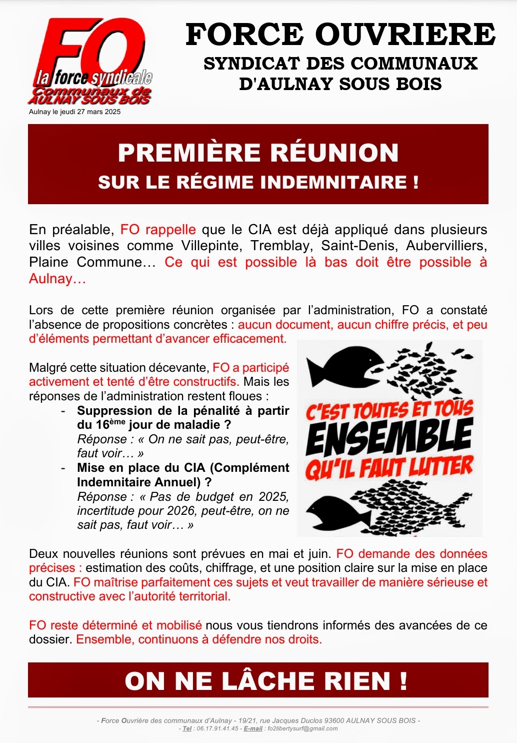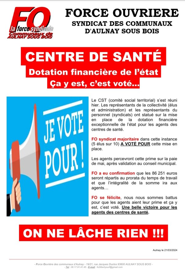 Force Ouvrière Aulnay-sous-Bois exige que les agents volontaires pour le 2nd tour soient quand même payés