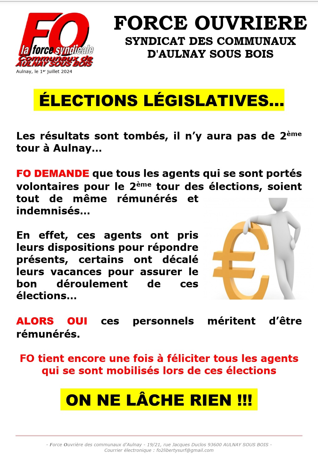 Vous trouverez ci-dessous un communiqué de Force Ouvrière concernant les agents de la ville d’Aulnay-sous-Bois et le paiement pour le 2nd tour des législatives 2024… qui n’aura pas lieu. Faute de concurrence ou suite à une campagne remarquable, la candidate Nouveau Front Populaire n’aura pas eu besoin d’un second tour pour l’emporter.