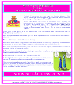 Nous tenons à préciser que notre communication aurait été moins agressive si la Direction de la Petite Enfance avait accepter de recevoir une délégation du personnel lorsque nous en avons fait la demande.