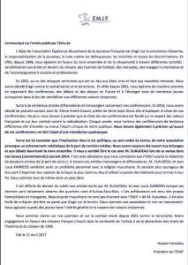 L’Espérance Musulmane de la Jeunesse Française (EMJF) est une association puissante à Aulnay-sous-Bois, qui compte de nombreux adhérents. Elle organise quelques voyages pour les jeunes (notamment des quartiers Nord) et organise quelques conférences sur de nombreux thèmes de société, y compris bien entendu la religion. L’invitation de certains conférenciers qui ont suscité la polémique dans le passé n’ont pas laissé de marbre les militants écologistes Hervé Suaudeau (candidat aux législatives en 2012) et Jean-Louis Karkides (soutien des candidats FLUO et prétendu écologiste).