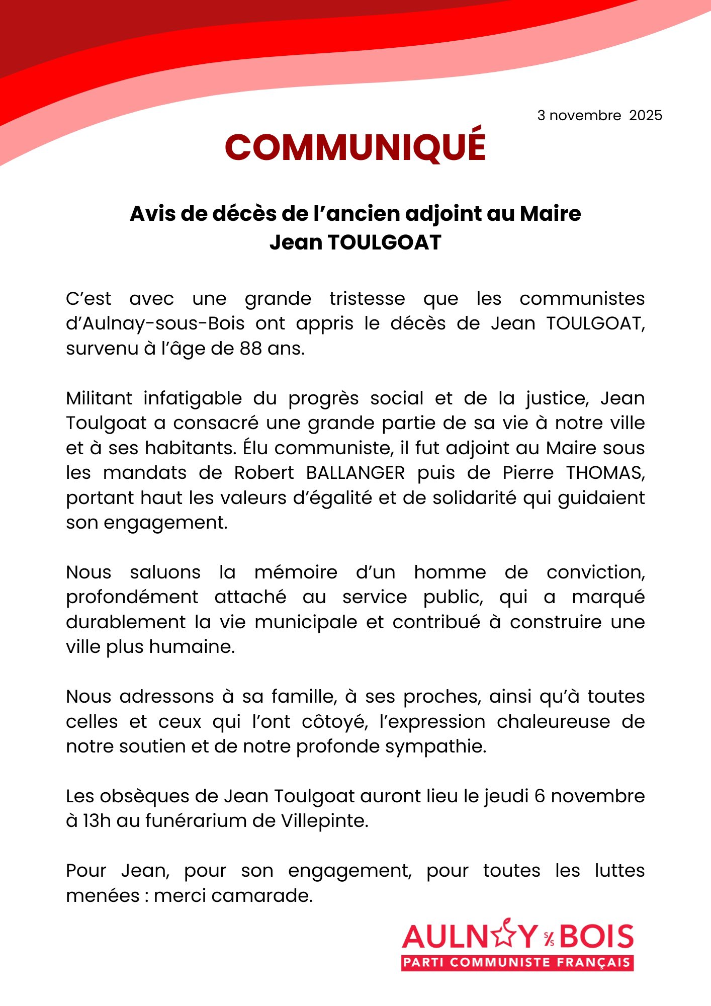 Les communistes d’Aulnay-sous-Bois ont la grande tristesse d’apprendre le décès, à l’âge de 88 ans, de Jean TOULGOAT, ancien élu communiste de notre ville. Jean Toulgoat était une figure locale et communiste convaincu, comme une bonne partie de sa famille.