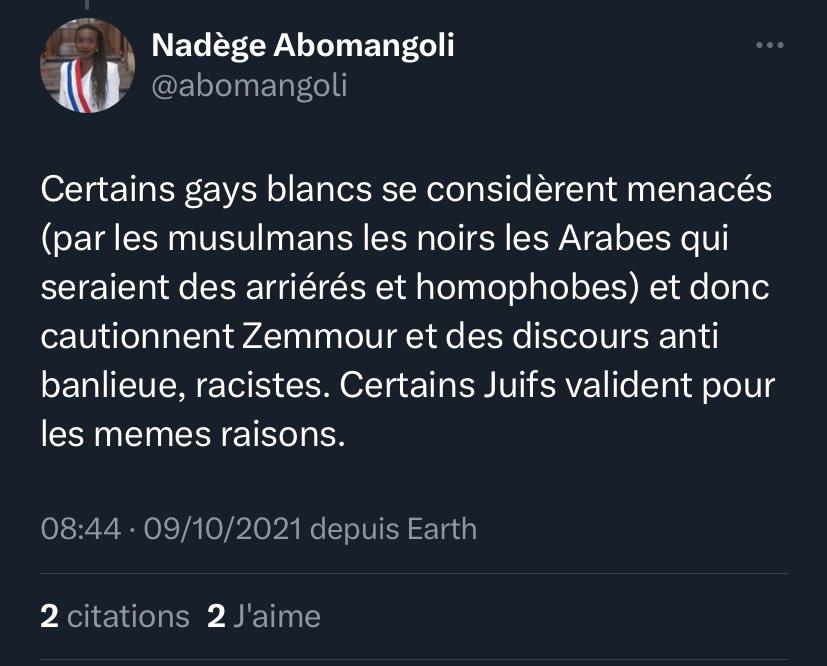 Dans certains pays d’Afrique et du Moyen-Orient, l’homosexualité est proscrite et combattue, avec possibilité d’exécution, de persécution ou d’emprisonnement. Des pays notamment au Moyen-Orient ont une éducation ouvertement antisémite. Des personnes homosexuelles (qui ne sont pas toutes blanches, contrairement à ce qu’affirme Nadège Abomangoli) se sentent ainsi menacées, sans pour autant se rapprocher d’Eric Zemmour. Des personnes ont déjà témoigné de la difficulté d’être homosexuelles tout en résidant en banlieue.