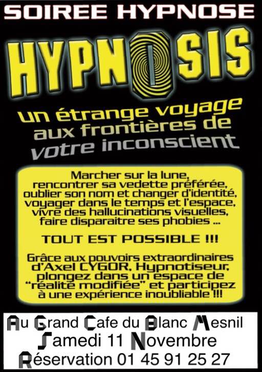 » Axel CYGOR » hypnotiseur aux pouvoir extraordinaire sera parmi nous pour vous faire participer à une expérience inoubliable !!