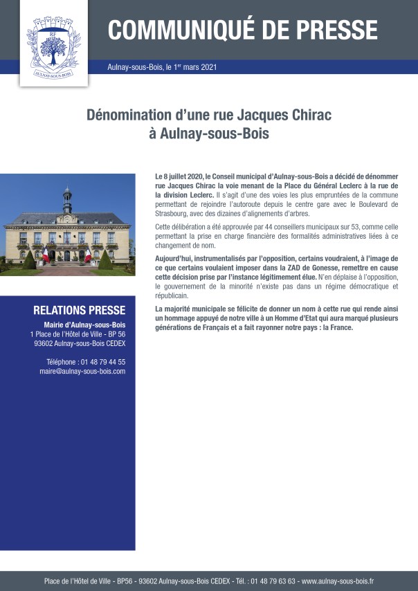 Droit de réponse aux déclarations de l’opposition municipale relatives à la « rue Jacques Chirac » à Aulnay-sous-Bois