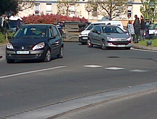Dans la violence du choc l’une des deux voitures à été renversée..