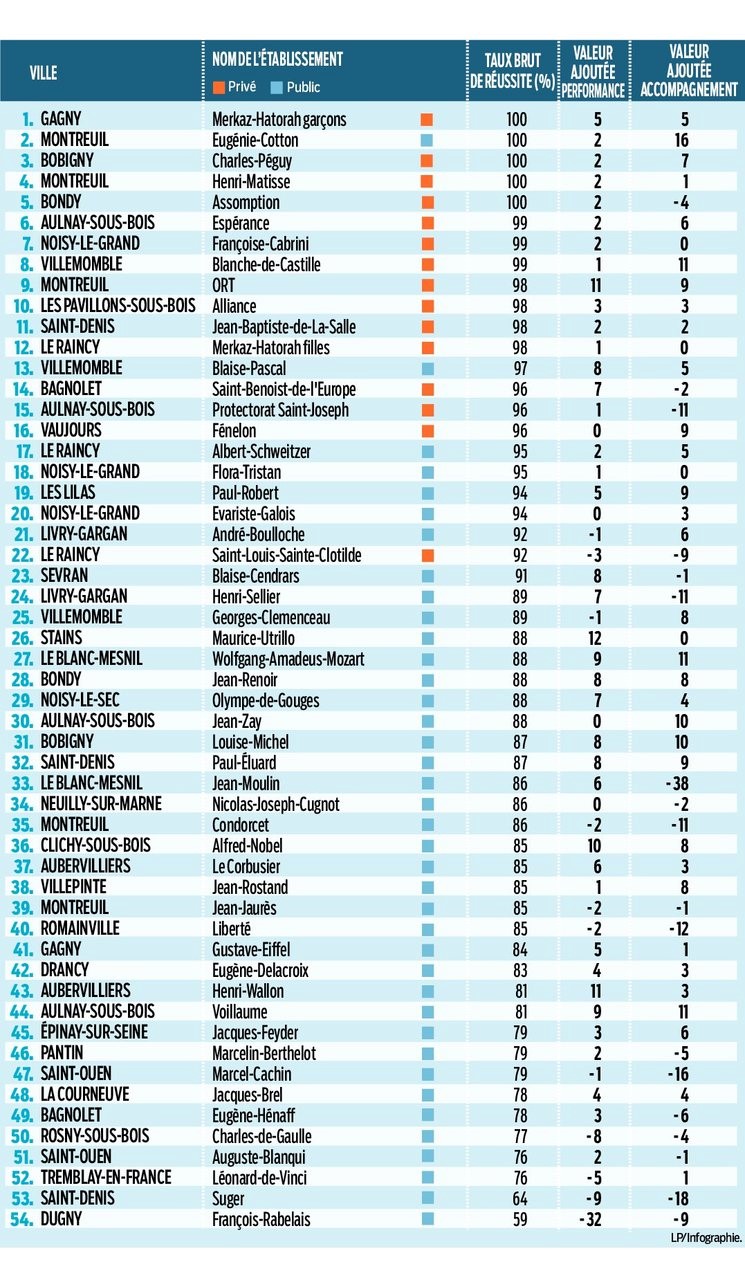 Rien n’y fait : les lycées privés restent toujours en tête parmi les établissements scolaires les mieux classés, bien devant les établissements publics. Le classement obtenu au travers du Parisien (cf image ci-contre) montre en effet que, pour toute la Seine-Sant-Denis, le Lycée Espérance arrive en 6ème position, le Protectorat Saint-Joseph en 15ème position, le lycée Jean Zay en 30ème position, alors que le lycée Voillaume reste loin derrière en 44ème position (sur 54).