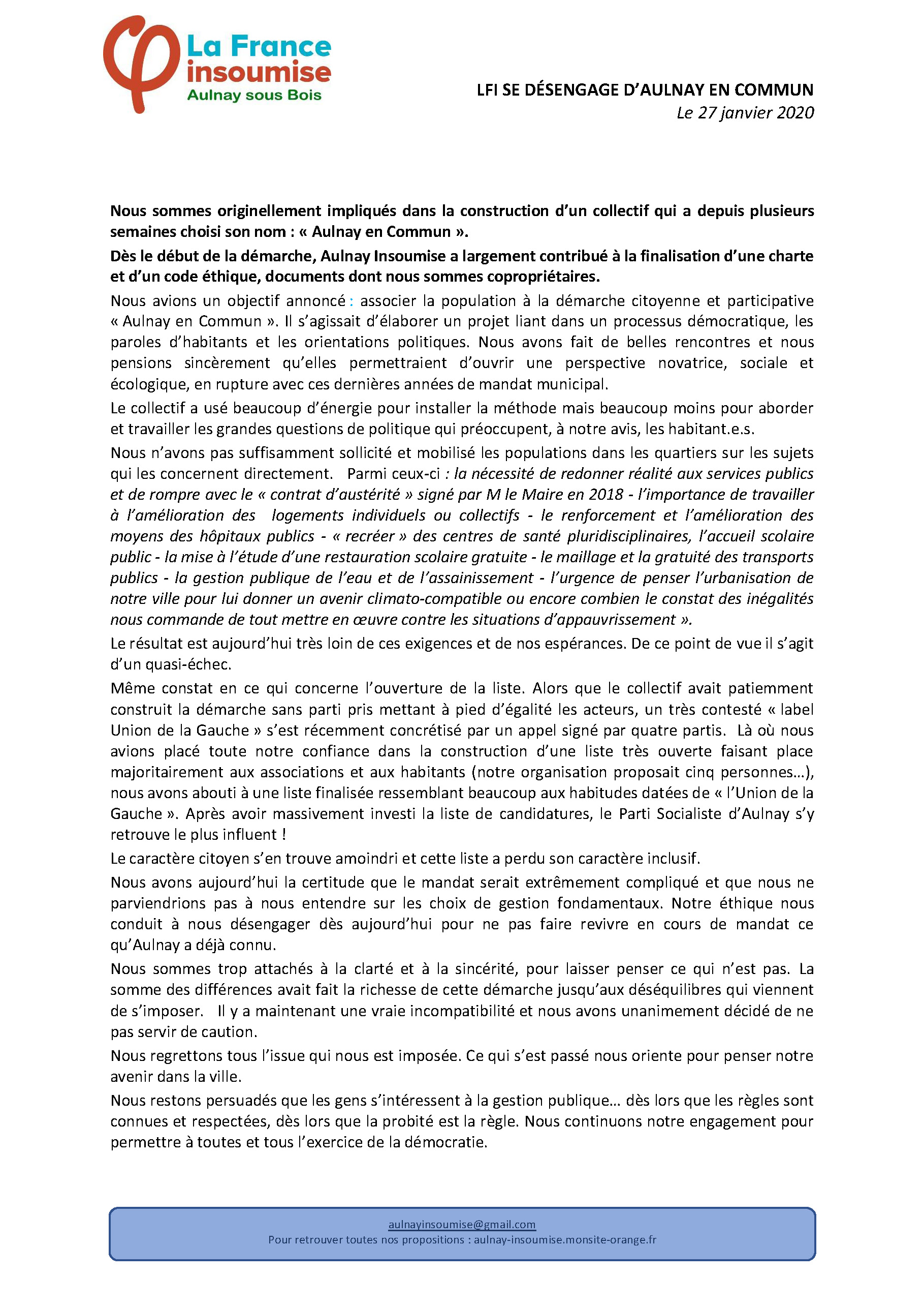 Gros désaccord de La France Insoumise qui regrette que la liste Aulnay En Commun ne se préoccupe pas des questions majeures des quartiers. De plus, LFI regrette que la liste soit trop politisée sous le slogan « Union de la Gauche » alors que LFI voulait une ouverture aux associations.