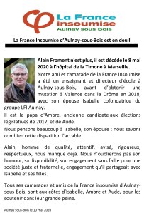 Tous ses camarades et amis de la France insoumise d’Aulnay-sous-Bois, sont aux côtés d’Isabelle, Ambre et Aude, pour les soutenir dans leur grande peine.