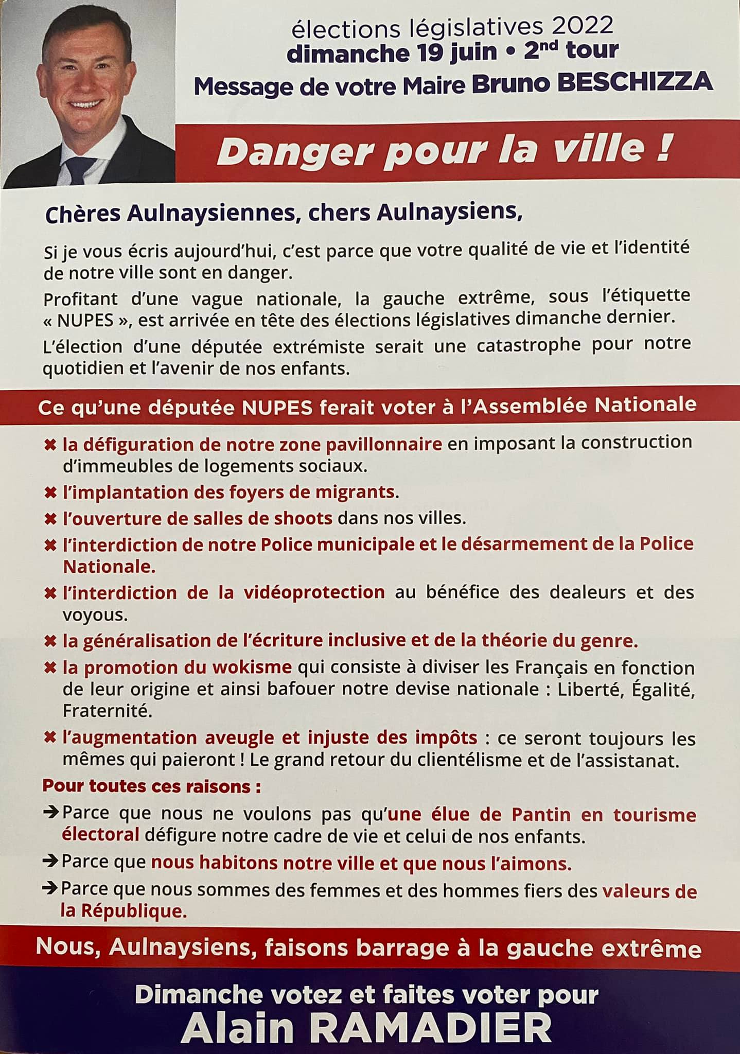 Tract surprenant du Maire d’Aulnay-sous-Bois pour appeler à voter Alain Ramadier contre le péril rouge