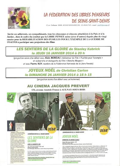 La Fédération des Libres Penseurs de la Seine-Saint-Denis invite les personnes qui le souhaitent à participer aux séances ciné-débat de Jacques Prévert, les 16 et 26 janvier prochains. Deux films sur la grande guerre sont à l’honneur :