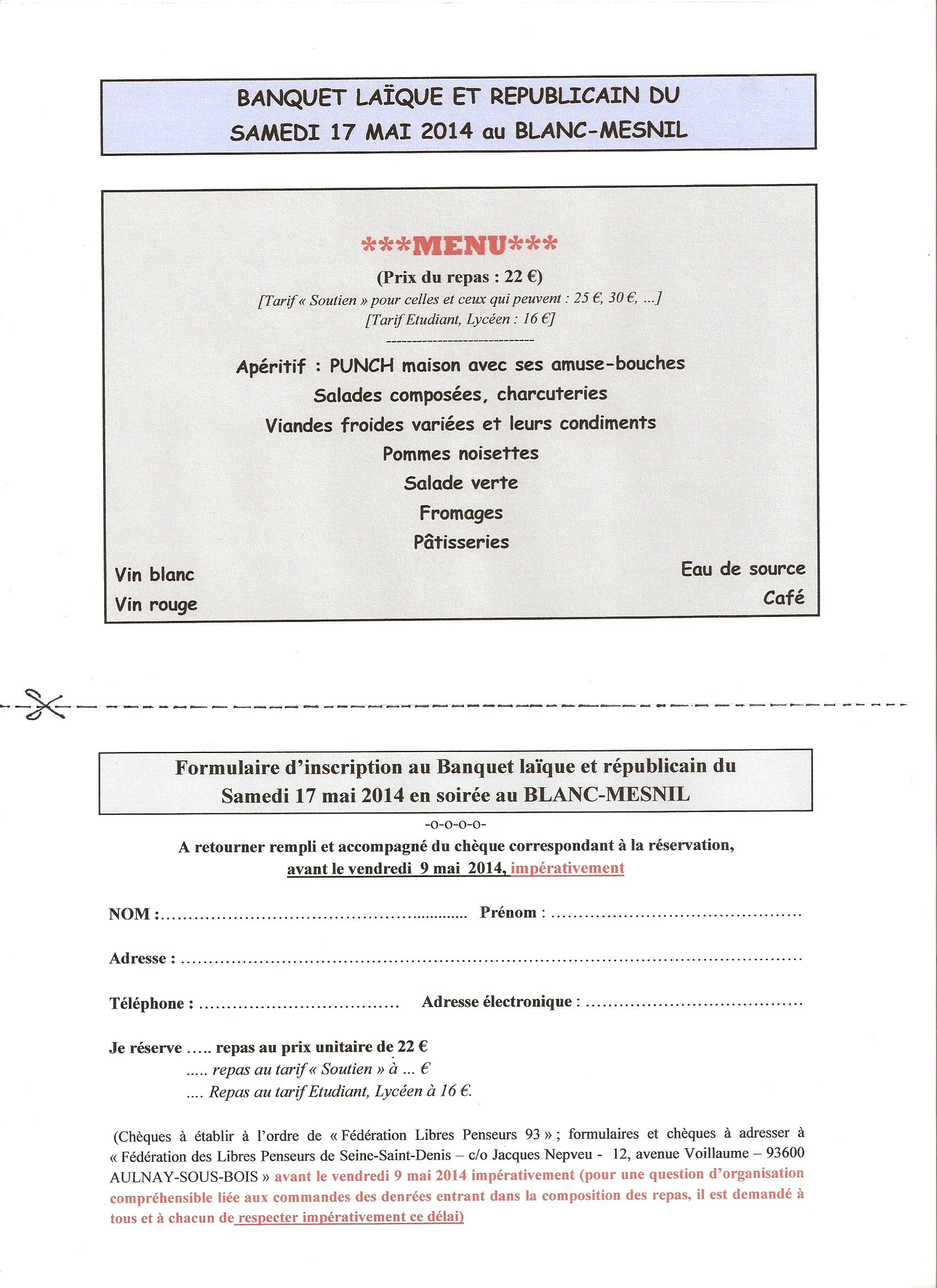 La fédération des Libres Penseurs de la Seine-Saint-Denis organise, au Blanc-Mesnil le 17 Mai, un banquet Laïque et Républicain pour commémorer le 143ème anniversaire de la Commune de Paris. Ce banquet est organisé dans la salle Claude Terrasse, 2 rue Claude Terrasse au Blanc-Mesnil.