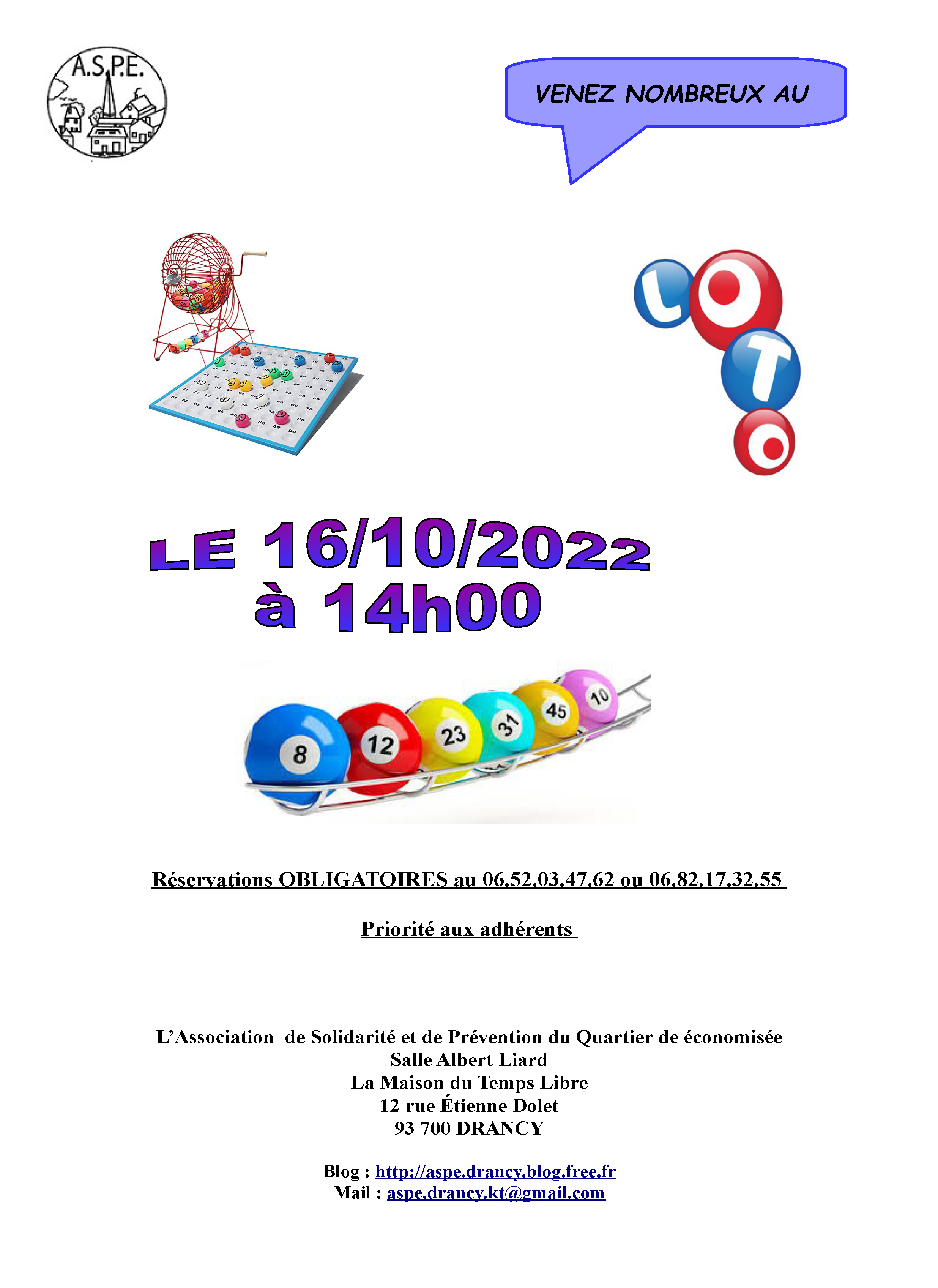 Venez nombreux au loto de l’ASPE du dimanche 16 octobre à 14h00.