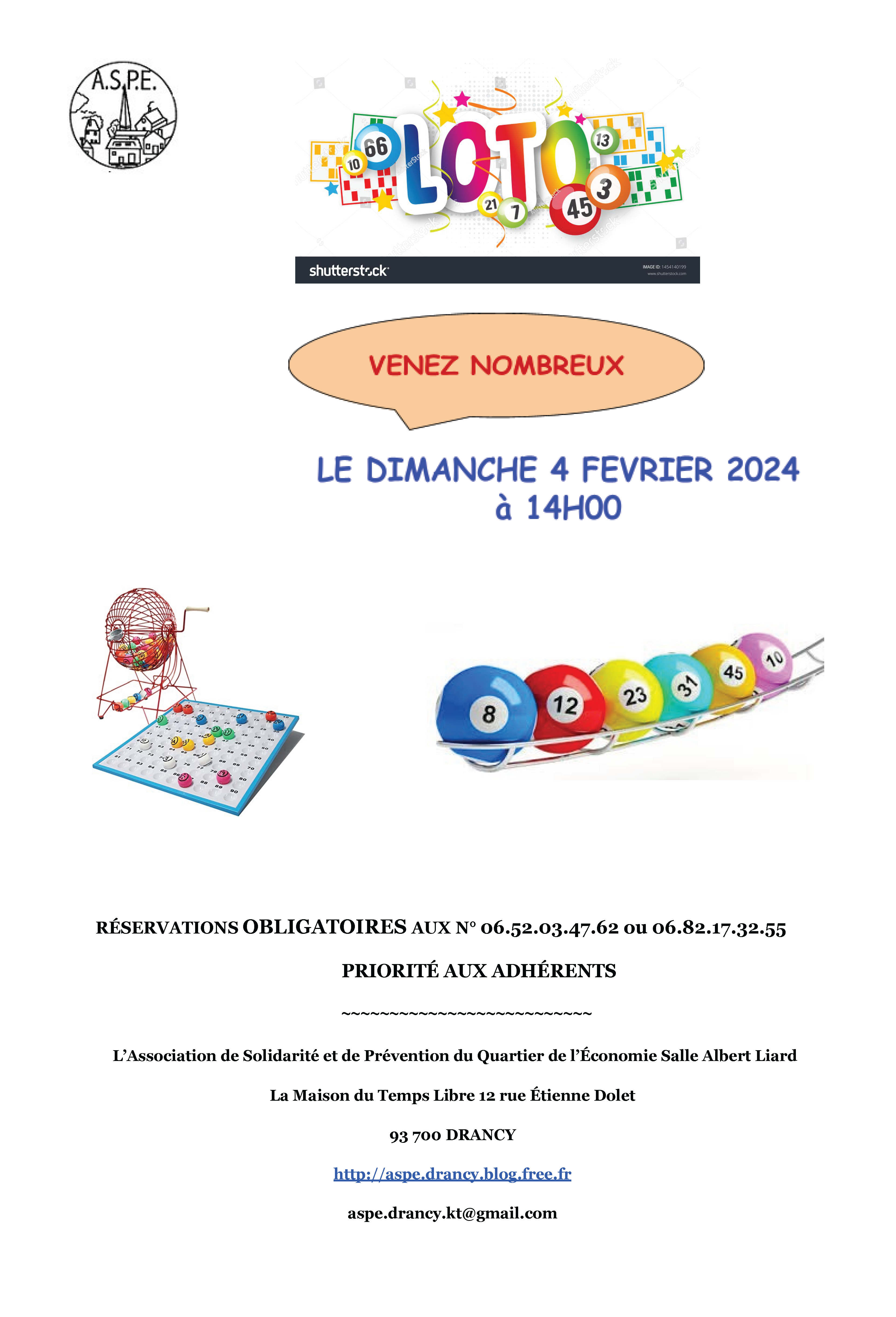 L’Association de Solidarité et de Prévention du Quartier de l’Économie (ASPE) vous propose un Loto le 4 février à Drancy, à partir de 14h.