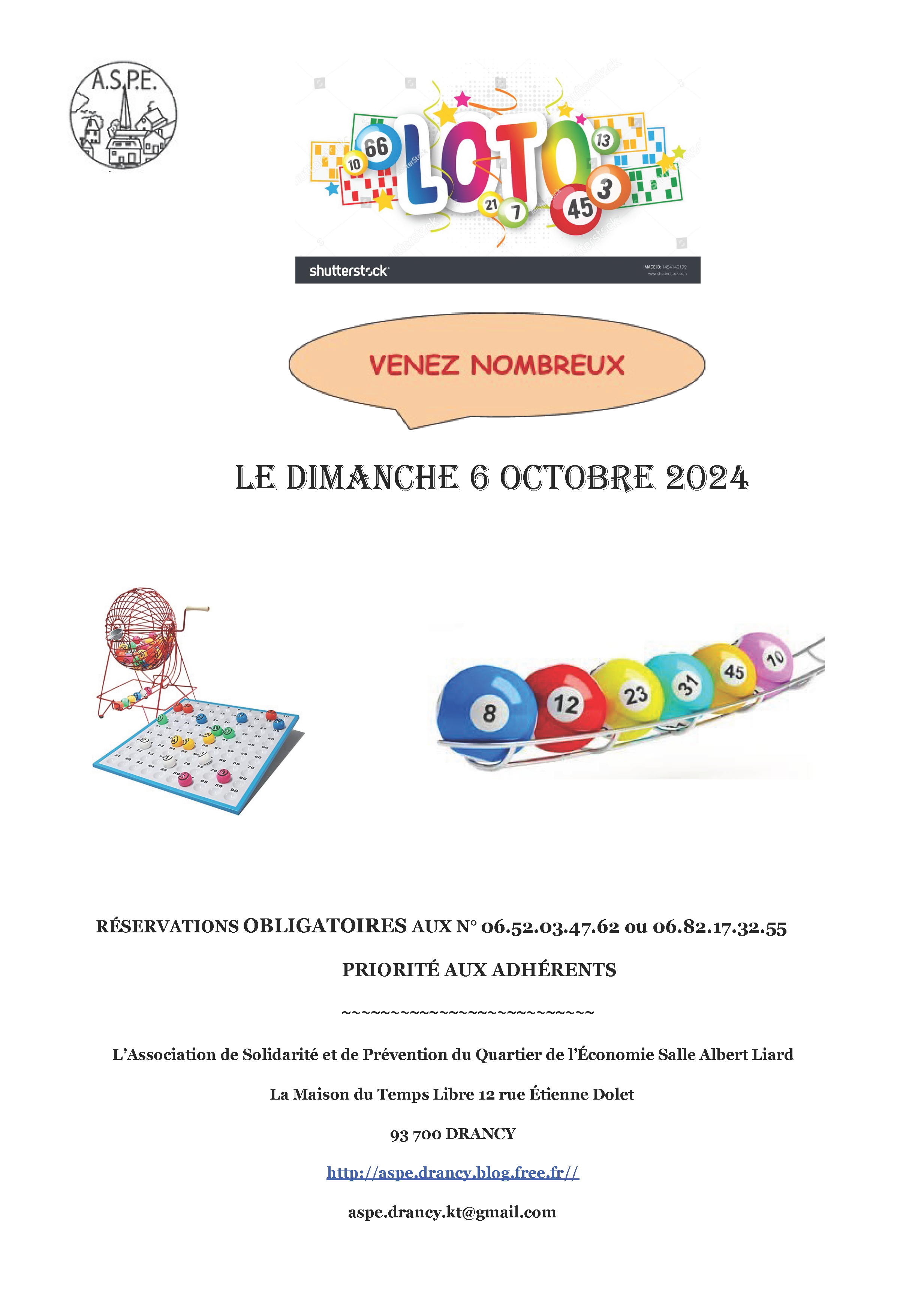 l’ASPE de Drancy organise un loto à Drancy le dimanche 6 octobre.
