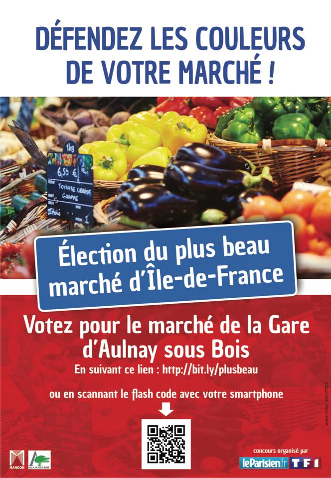 Défendez les couleurs de votre marché ! Jusqu’au 9 avril prochain, votez et faites voter pour le marché de la Gare d’Aulnay-sous-Bois, sélectionné par Le parisien et TF1 pour l’élection du plus beau marché d’Île-de-France