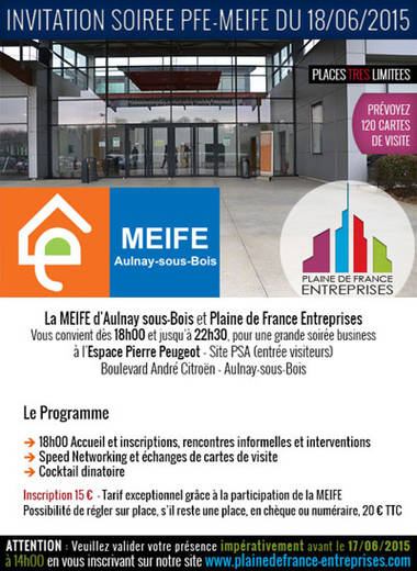 Un Speed Networking est organisée le jeudi 18 juin de 2015, de 18h00 à 22h30, à l’espace Pierre Peugeot (site PSA, Boulevard André Citroën entrée visiteurs). Cet évènement rassemble 120 entrepreneurs.