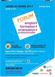 Le Jeudi 23 Mars 2017 se tiendra, à Aulnay-sous-Bois, la 6ème édition du Forum de l’Emploi, de la Formation et de l’Orientation Professionnelle, événement incontournable sur le territoire pour les demandeurs d’emploi en recherche d’un emploi, d’une formation ou d’un accompagnement, pour les salariés, pour les étudiants en recherche d’un job d’été, d’un contrat en alternance, d’une orientation professionnelle…