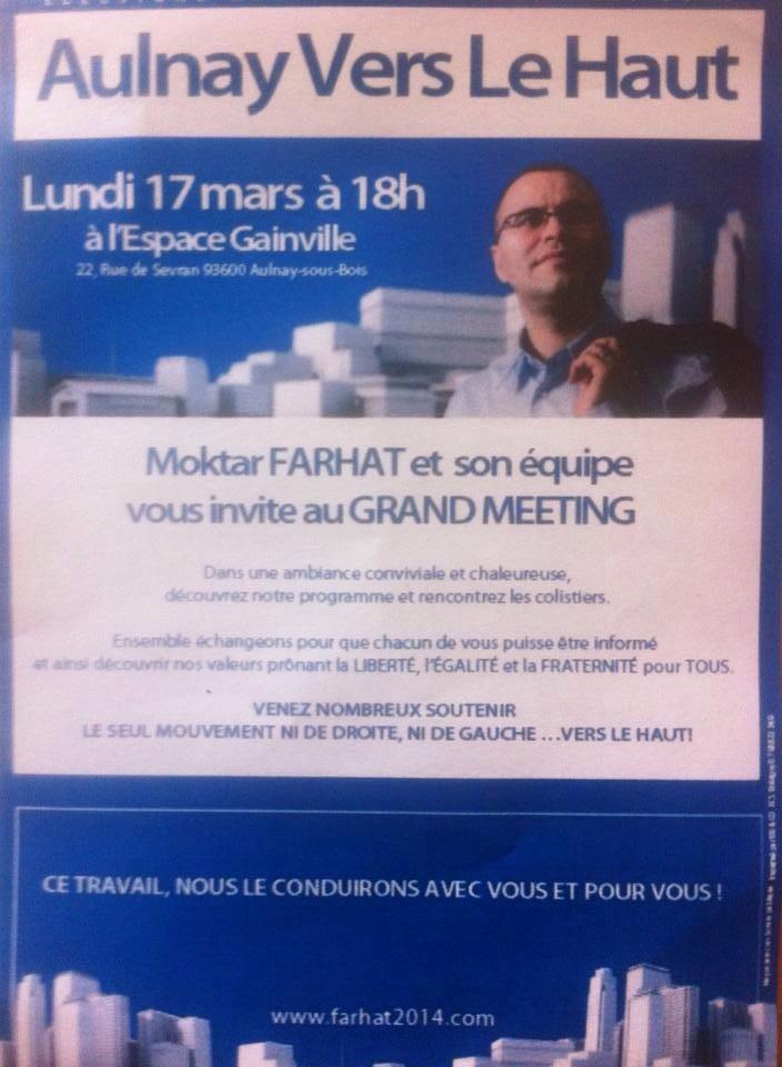 Elections municipales 2014 à Aulnay-sous-Bois : Grand Meeting de Moktar Fahrat salle Gainville le 17 mars