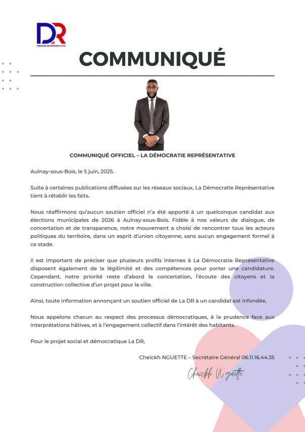 Bien qu’un rapprochement significatif a pu être établi entre la Démocratie Participative et Oussouf Siby, candidat PS aux municipales 2026 à Aulnay-sous-Bois, son président Cheickh Nguette a préféré prendre ses distances temporairement. Dans un communiqué disponible ci-dessous, il affirme qu’aucune décision définitive n’a été prise. Le soutien pour Oussouf Siby n’est pas encore officiellement confirmé.