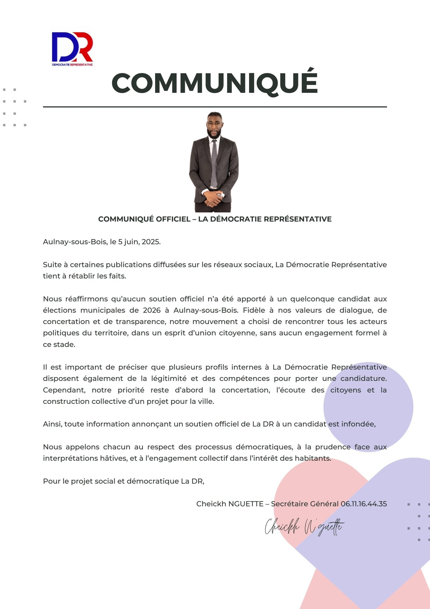 Bien qu’un rapprochement significatif a pu être établi entre la Démocratie Participative et Oussouf Siby, candidat PS aux municipales 2026 à Aulnay-sous-Bois, son président Cheickh Nguette a préféré prendre ses distances temporairement. Dans un communiqué disponible ci-dessous, il affirme qu’aucune décision définitive n’a été prise. Le soutien pour Oussouf Siby n’est pas encore officiellement confirmé.