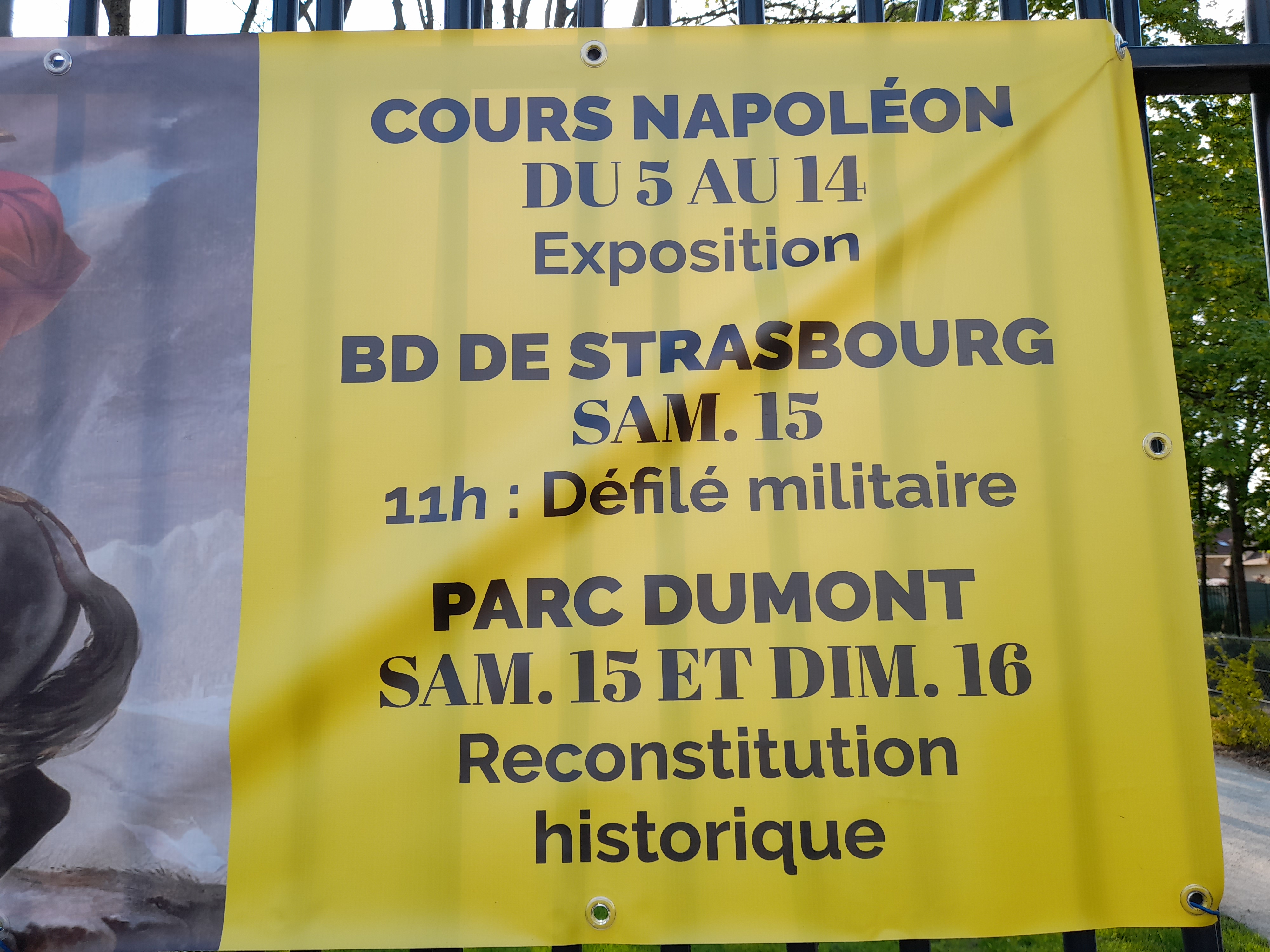 En raison des mauvaises conditions météorologiques annoncées pour le week-end du 15 et 16 mai, la célébration du bicentenaire de Napoléon Bonaparte, prévue sur le Boulevard de Strasbourg et au Parc Dumont, est annulée et reportée à une date ultérieure.