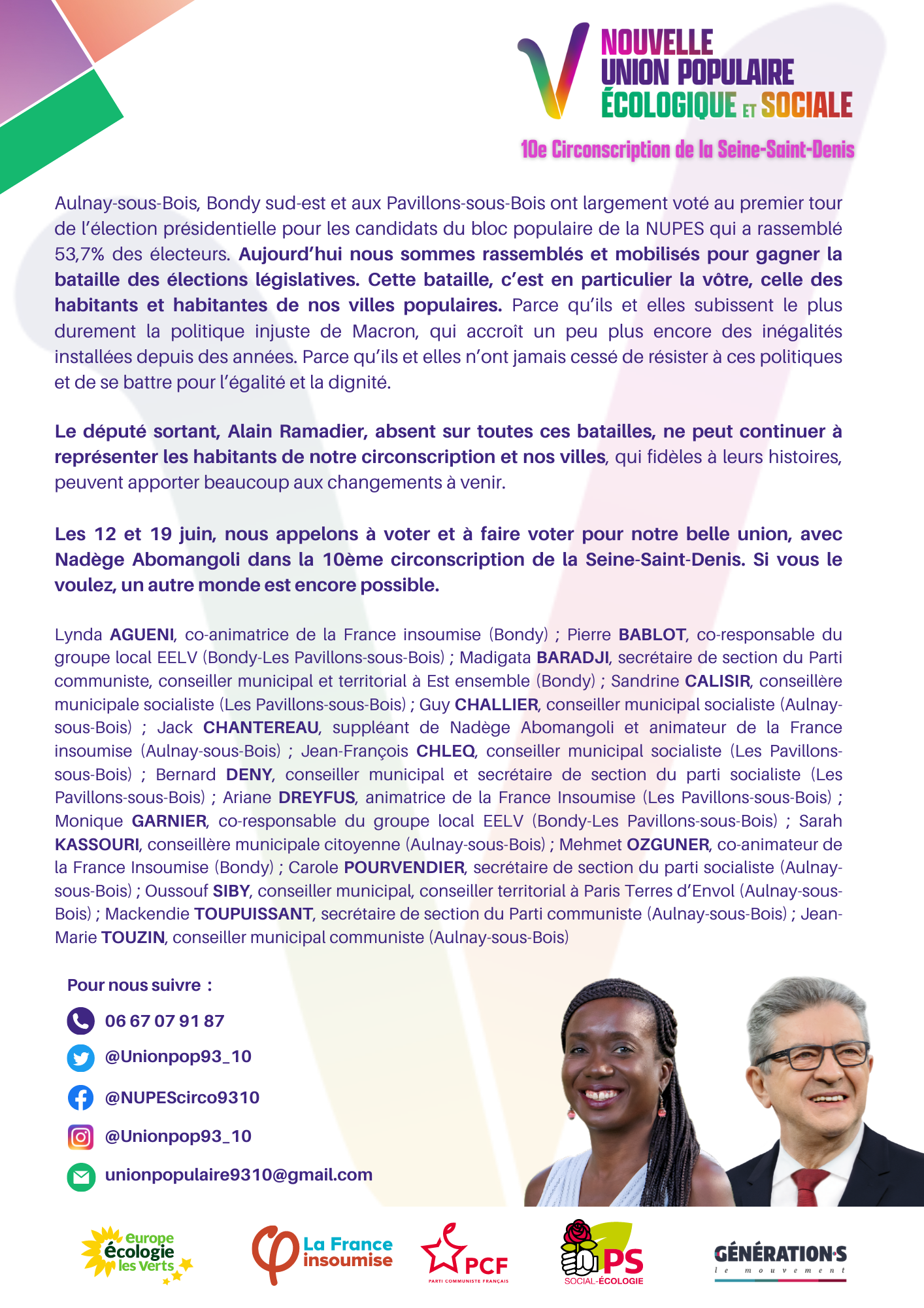 Nous appelons les électrices et les électeurs qui se sont abstenus au 1er tour, tout particulièrement les jeunes, à se mobiliser et à venir voter pour porter à l’Assemblée Nationale Nadège ABOMANGOLI, candidate NUPES pour répondre à l’urgence sociale et écologique.