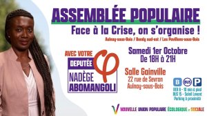Pour faire le point sur cette rentrée politique et organiser nos actions à Aulnay-sous-Bois, Bondy sud-est et Les Pavillons-Sous-Bois, nous vous invitons à une assemblée populaire de circonscription de la NUPES autour de notre députée Nadège Abomangoli et des citoyens et citoyennes engagés.