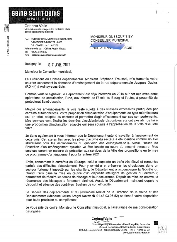 Il y a quelques mois j’écrivais au Président du Conseil Départemental de la Seine-Saint-Denis, Stéphane Troussel concernant la circulation sur la route départementale Jacques Duclos.
