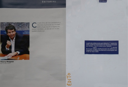 « La période préélectorale ayant débuté le 1er septembre 2019, la liberté d’expression de l’équipe municipale est limitée.C’est la raison pour laquelle, ………… maire de ………… a décidé de ne pas rédiger d’éditorial dans les éditions du magazine précédant les élections municipales des 15 et 22 mars 2020 .»