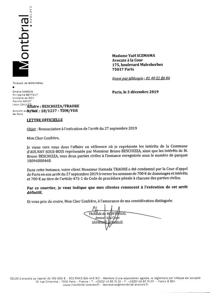 Par l’intermédiaire de son cabinet d’avocats, Bruno Beschizza a décidé à renoncer à cet arrêt. En échange, Hadama Traoré promet la plus stricte neutralité et de ne plus critiquer Bruno Beschizza jusqu’aux résultats des municipales 2020 à Aulnay-sous-Bois.