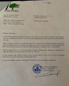 - Un courrier daté du 20 février signé par M.Cahenzli mais par délégation du Maire ayant pour objet « Session amiable », adressé à chaque riverain leur faisant miroiter la possibilité d’agrandir leur terrain car contigu à leur propriété, ce courrier mentionne même « cédé » mais rectifié ensuite « une évaluation du prix au m2 sera demandé à France Domaine »…et ce courrier précise bien « un découpage foncier »! et le PLU ?