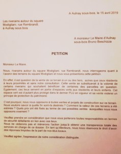 - Une pétition des riverains datée du 15 avril s’opposant à cette disparition précisant entre autres que c’est un lieu qui sert d’espace vert aux résidents et à leurs enfants et qu’il est protégé dans le dernier PLU en vigueur et que sa vente violerai un principe de protection du patrimoine !
