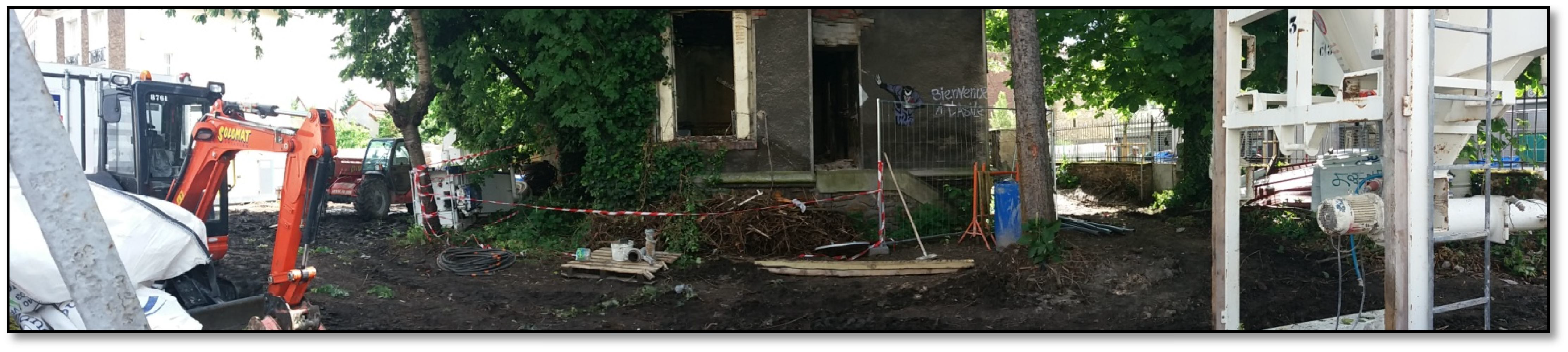 Ci dessous le même chantier à une autre étape de sa construction. La terre pleine a été excavée et remplacée par du béton. Voilà pourquoi on ne pourra plus jamais y planter des arbres ! Espérons néanmoins que les eaux de pluie les jours de gros orages n’iront pas inonder les constructions et pavillons environnants….