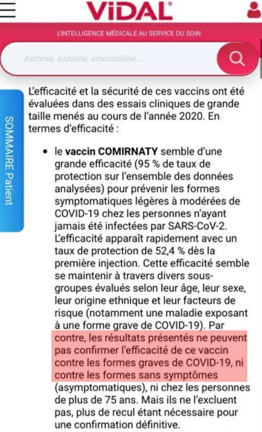 - Le Vidal précise que rien ne permet de confirmer ni d’infirmer l’efficacité des vaccins contre les formes graves (cf. capture).