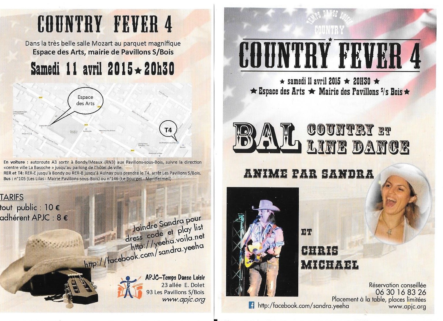 L’Association » Country Fever 4 » organise un bal country et Line dance le samedi 11 avril 2015 à 20 h 30, à l’espace des arts, mairie des Pavillons-sous-Bois.