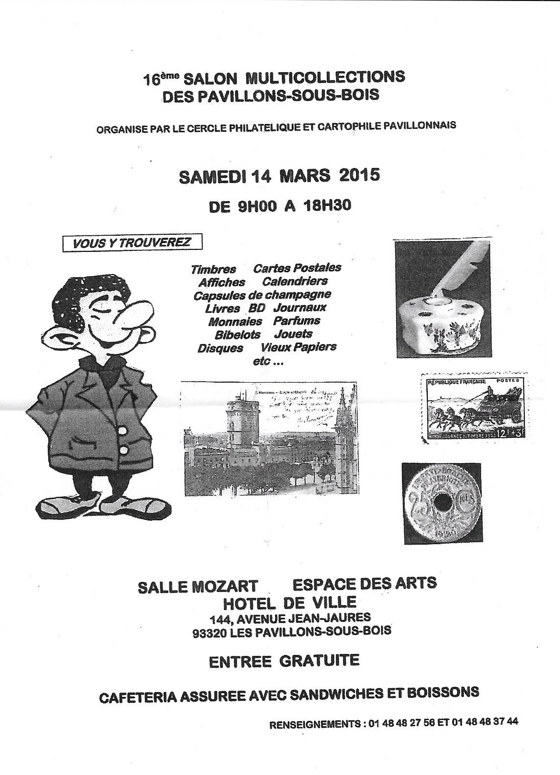 Le cercle Philatélique et cartophile Pavillonnais organise le 16eme salon multicollections le samedi 14 mars 2015 de 9h à 18h30.