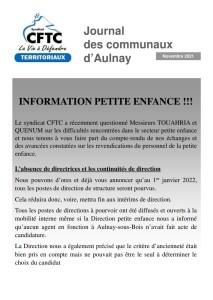 Journal CFTC des communaux d’Aulnay-sous-Bois sur la petite enfance