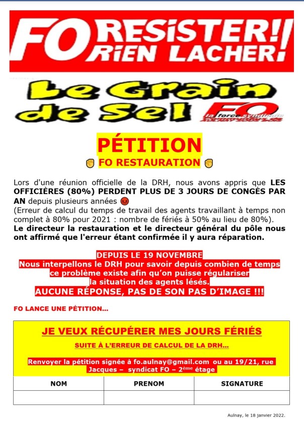 Force Ouvrière communaux d’Aulnay-sous-Bois initie une pétition pour régulariser les jours de congés