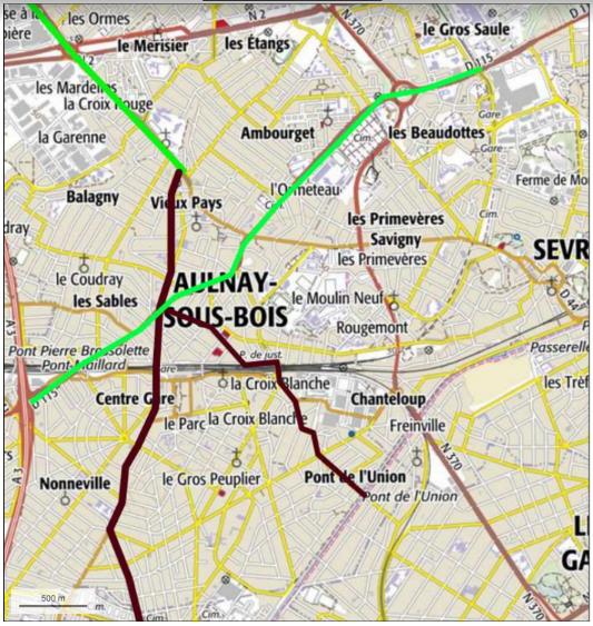 Dans la carte affichée ci-dessus, nos propositions permettront de disposer d’axes transversaux pour rejoindre d’une part les axes départementaux et d’autre part le canal de l’Ourcq.