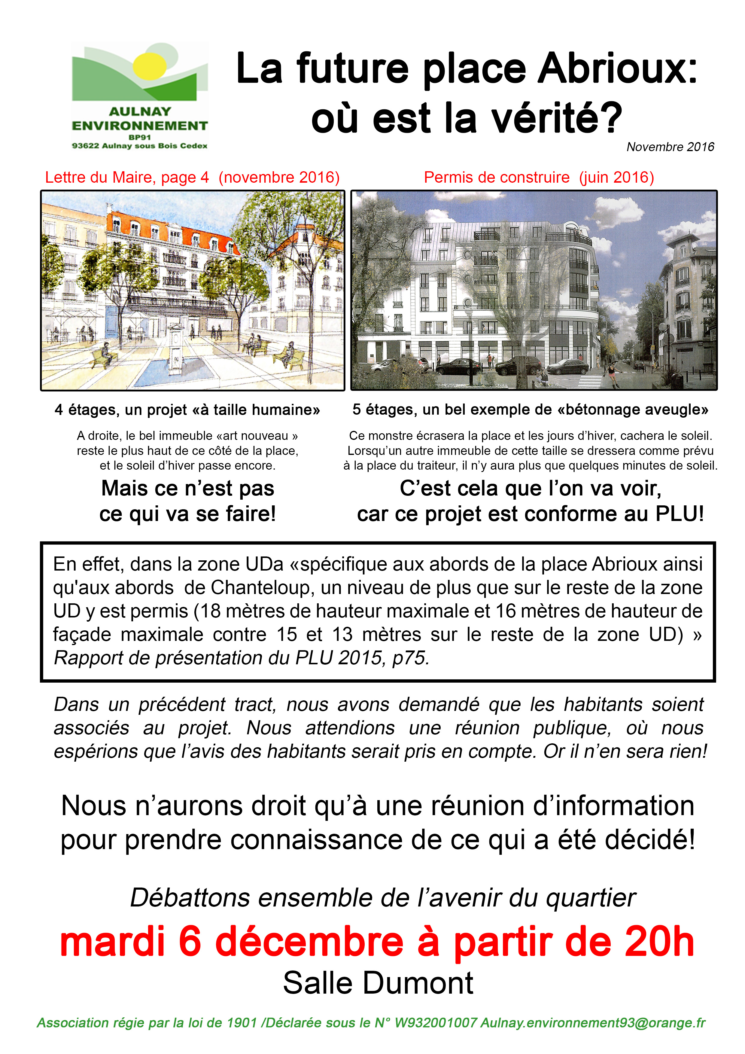 Désinformation ou incompétence ? Eu égard aux bonnes relations humaines que nous entretenons avec notre Maire, nous pencherons pour la 2e hypothèse. Non, le n° 5 de la « Lettre du Maire » ne cherche pas sciemment à cacher la vérité aux Aulnaysiens en leur présentant en page 4 une jolie vue d’artiste de la future place Abrioux, avec un charmant immeuble de 4 étages, alors que le permis approuvé par le Maire va permettre une énorme construction de 5 étages qui va cacher le soleil en hiver et dénaturer la place. (voir le tract) C’est évidemment en contradiction avec l’affirmation d’ « avoir mis fin au bétonnage aveugle » (p1) qui nous laisse perplexe. Nous souhaitons que les Aulnaysiens soient correctement informés de ce qui les attend, et que le service documentation soit sévèrement réprimandé pour avoir étourdiment proposé un document qui instille le doute sur la bonne foi de la municipalité.