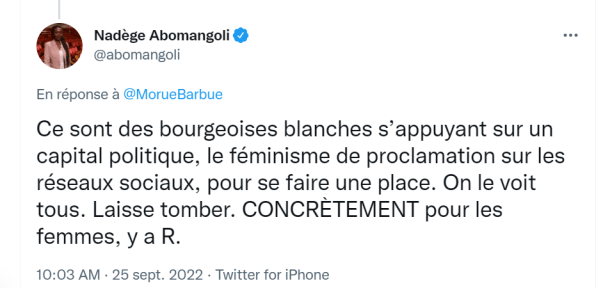 La députée Nadège Abomangoli conchie les bourgeoises blanches féministes