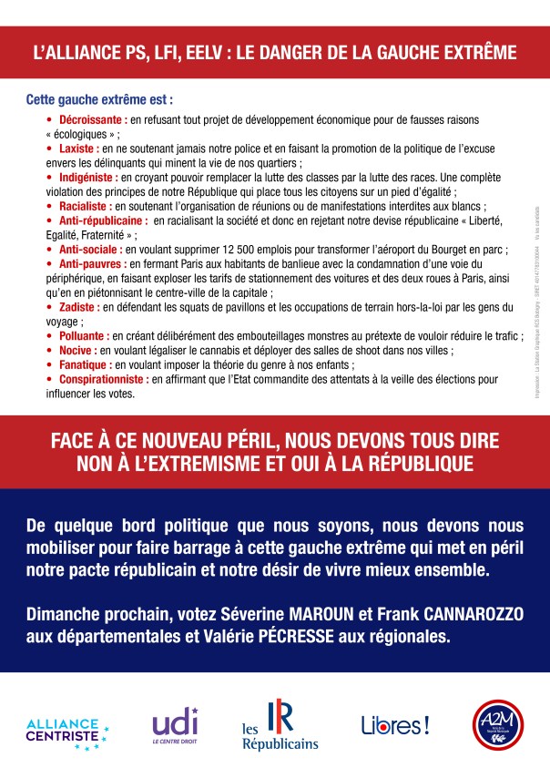 Ce n’est pas nouveau mais le procédé reste toutefois choquant : l’association A2M proche de Bruno Beschizza distribue un tract très critique sur l’alliance de Gauche notamment pour la région Île-de-France. On y voit encore une allusion à la théorie du genre mais aussi sur le déploiement des salles de shoot. Que ce soit à Gauche ou à Droite, la soupe est bonne et tous les moyens sont bons pour discréditer l’autre. Qui est le responsable de l’abstention ?