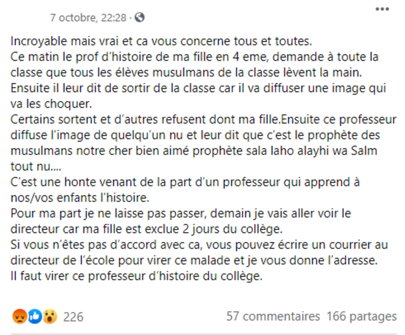 Il semblerait que ce soit le mécontentement du père d’une élève de 4ème et l’expression de sa colère sur les réseaux sociaux qui soit à l’origine de la montée en puissance de la haine à l’encontre du professeur d’histoire-géographie et de l’instrumentalisation à charge qui a été faite par la suite des caricatures de Mahomet présentées dans le cadre d’un cours sur la liberté d’expression.