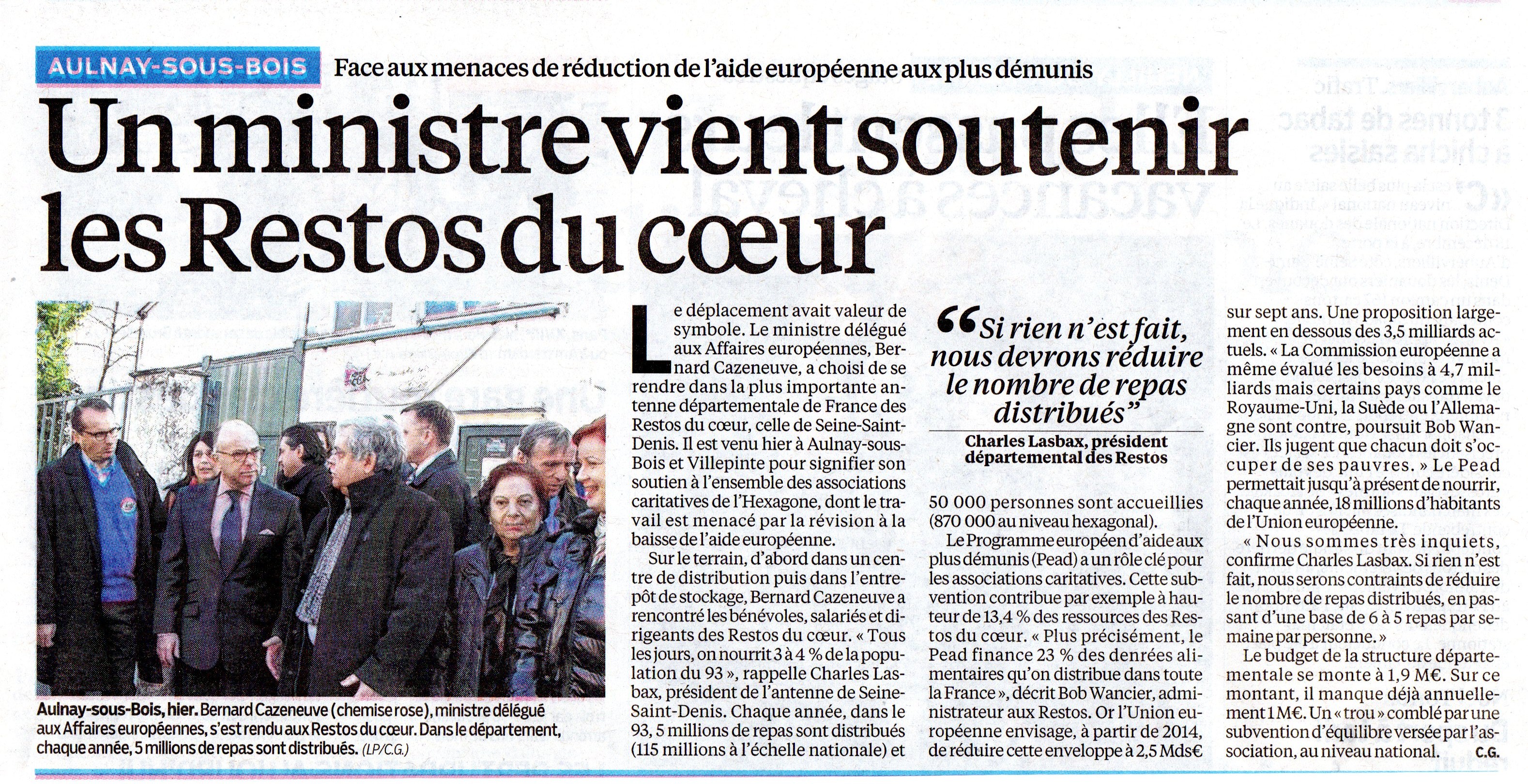 Le ministre délégué aux affaires européenne, Bernard Cazeneuve, est venu rendre visite à l’antenne départementale des Restos du Coeur la plus importante de Seine-Saint-Denis, celle d’Aulnay-sous-Bois et de Villepinte. Bien entendu, le Maire Gérard Ségura était convie à ce rendez-vous symbolique.