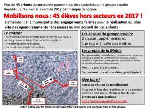Les RPE (Représentants des Parents d’Elèves) des écoles République et Le Parc ont ouvert un blog pour y communiquer informations et revendications. L’une de leurs revendications principales concerne l’agrandissement du groupe scolaire.