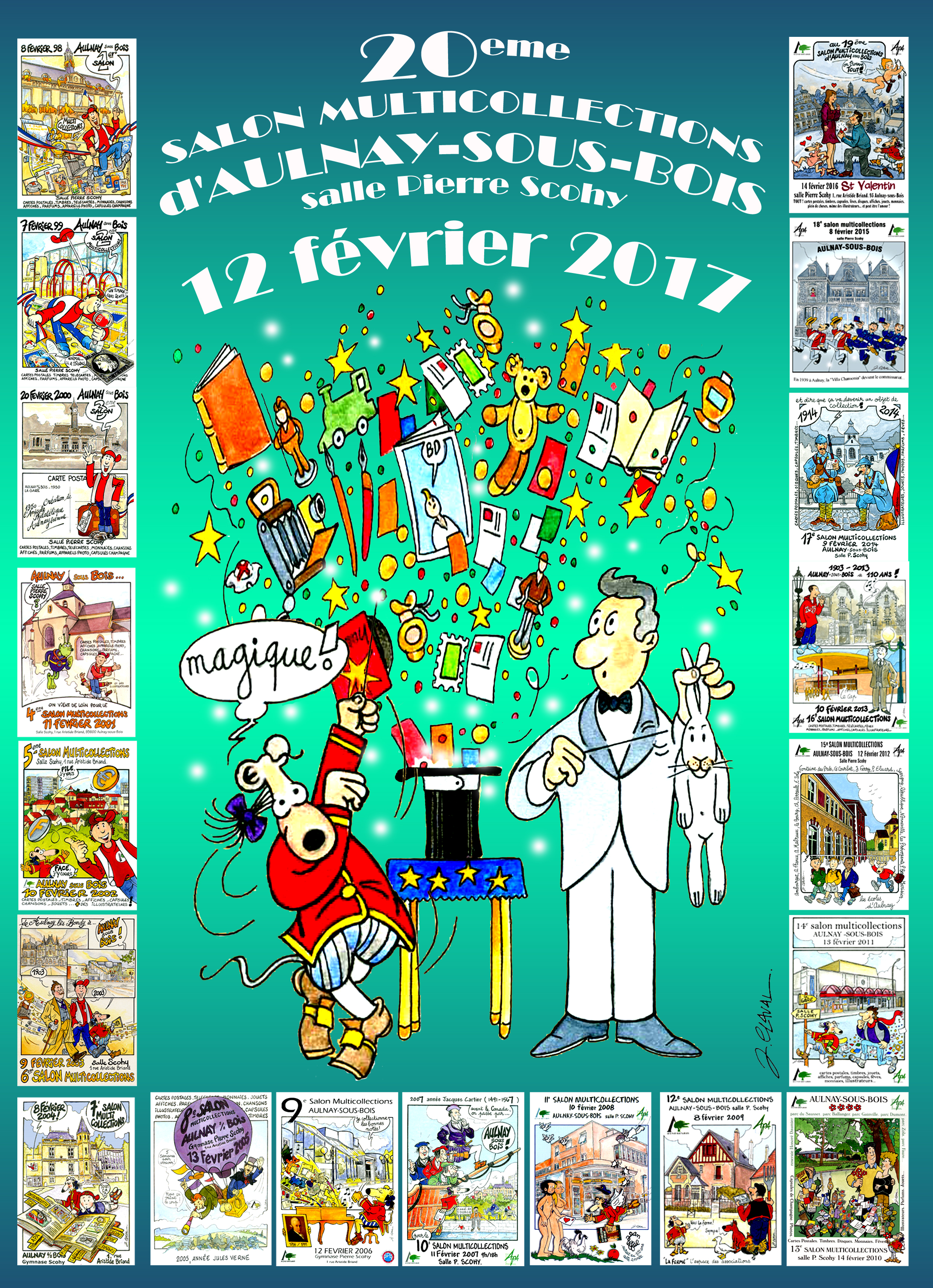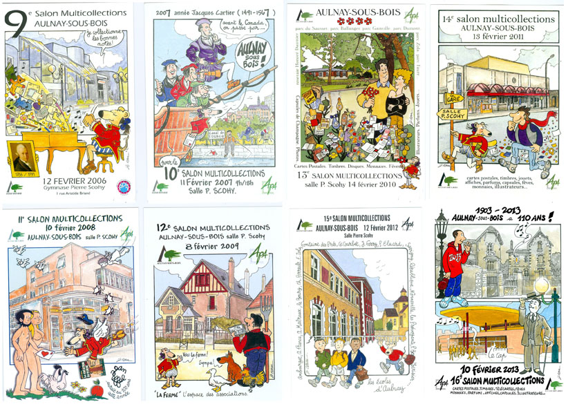 Jean Claval, très célèbre illustrateur local, a envoyé à la rédaction l’ensemble des cartes d’illustration des salons multicollections d’Aulnay-sous-Bois, de 1998 à nos jours.